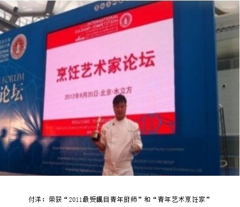 [摘要] 在首屆北京奧林匹克公園國際美食大賽暨第留屆東方美食烹飪藝術(shù)家國際大賽,第一場(chǎng)個(gè)人賽中,付洋勇奪第一名。在烹飪藝術(shù)家論壇頒獎(jiǎng)典禮上,付洋榮獲“2011年最受矚目青年廚師”和“青年藝術(shù)烹飪家”兩項(xiàng)大獎(jiǎng)。付洋:榮獲“2011最受矚目青年廚師”和“青年藝術(shù)烹飪家”