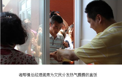 湘鄂情總經理?肅親自帶著配餐車,趕到救災現場,向群眾分發盒飯。他表示,湘鄂情做為首家在A股上市的民營餐飲企業,向災區人民奉獻愛心,是履行上市公司的企業社會責任,投身社會公益事業將是湘鄂情堅守的核心價值和長遠追求。