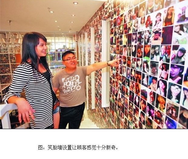 店主鄭鑫龍說,開業前一個月,他通過微博征集泉州市民的笑臉照。“總共征集到3500張照片,最后我選取了1000張,用特制的墻紙做成笑臉墻。”據介紹,照片上的人物大多數是泉州人,其中的主體是1993、1994年出生的美少女,她們的笑容或俏皮,或甜美,或秀氣。此外,還有少部分照片反映是寶寶的可愛表情。一邊看著美少女,一邊用餐,可以勾起人們的食欲,或許老板想營造的就是秀色可餐這一概念。
