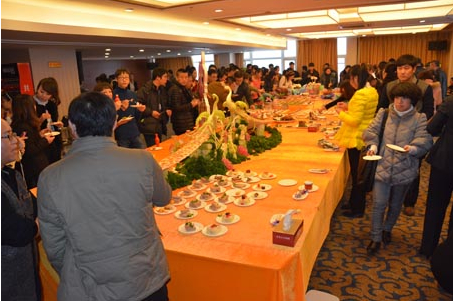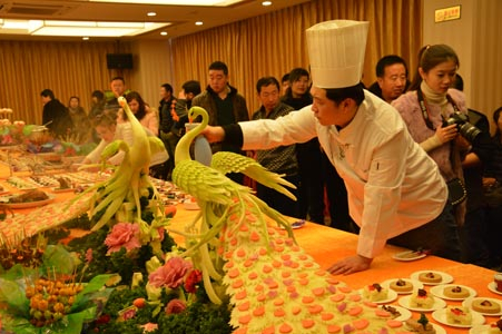 “跨年”野豬盛宴脫離了那種傳統的圓桌模式,以西方宴會特有的自助形式呈現在眾多美食達人面前。在一張寬3米、長15米的大型餐桌上,121道菜品被分成了13個區域進行擺放。