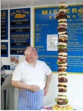 據(jù)英國(guó)《每日郵報(bào)》5月5日?qǐng)?bào)道,英國(guó)一家外賣(mài)店的老板日前成功做出了一個(gè)5英尺4英寸(約1.62米)高的巨型漢堡,據(jù)稱(chēng)其刷新了世界最高漢堡的紀(jì)錄。