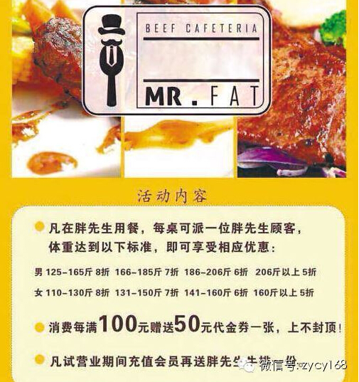 每桌可派一位胖先生顧客,體重達(dá)到以上標(biāo)準(zhǔn),即可享受相應(yīng)優(yōu)惠。