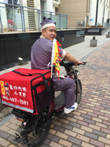 你可以想象這樣一個場景:車來車往的都市,長安街上,一個大俠裝扮的古裝小哥騎著電動車風馳電掣,一桿杏黃旗上書“蝦鼎記”在車流中隨風飄蕩,無數路人好奇地拿起手機拍照、發微博和朋友圈,甚至要求合影。到了客戶家:“大俠您好,我是蝦鼎記神行太!笨蛻艚舆^熱氣騰騰的海鮮,驚喜之余又接過一個骰盅、四枚骰子,點餐即可獲得一次搖骰子機會,四個六免單,四個六以外點數相加減掉相應錢數。于是,喜上加喜。