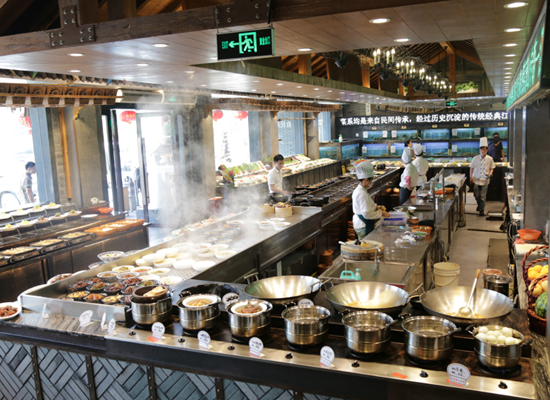 第一家店開了之后,生意很好,驗證了之前他對市場的分析。又經(jīng)過一番準(zhǔn)備,2014年,江南大院的土菜文化博物館的大院模式出現(xiàn)了,江南大院的第二家店,面積逾4000平米。這家店在體量上滿足了江南大院對于土菜展現(xiàn)的要求,門口600多平米的明檔,更讓消費者更直接體驗到土菜的氣氛。