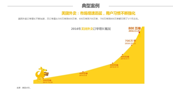 報(bào)告指出,外賣O2O市場(chǎng)增速迅猛,用戶習(xí)慣不斷強(qiáng)化。以美團(tuán)外賣為例,通過(guò)美團(tuán)外賣APP、美團(tuán)、大眾點(diǎn)評(píng)、手機(jī)QQ、微信等多元化的入口引流,截至今年9月,月活躍用戶數(shù)高達(dá)8,018萬(wàn)人。目前,美團(tuán)外賣的日訂單量更是超過(guò)了800萬(wàn)單,其中,日訂單量從500萬(wàn)單到600萬(wàn)單、600萬(wàn)單到700萬(wàn)單、700萬(wàn)單到800萬(wàn)單的增長(zhǎng)都只用了1個(gè)月左右。