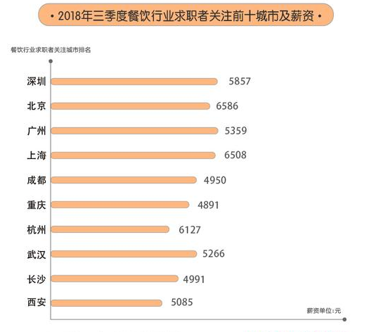 58同城的報告則顯示,2018年第三季度餐飲業(yè)求職者關注的前十城市分別為深圳、北京、廣州、上海、成都、重慶、杭州、武漢、長沙、西安,北上廣深四大一線城市成為最受歡迎的城市。